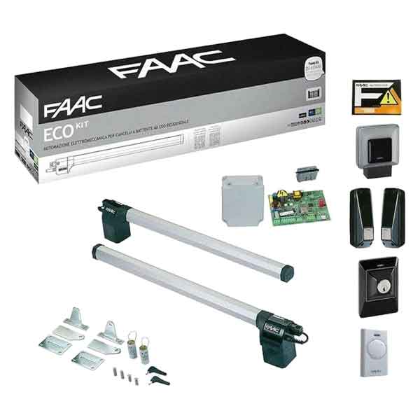 Kit completo per automazione ad anta battente da 230V. Larghezza max singola anta 1,8 m. Attuatori 412 230V corsa 290 mm. Angolo max apertura anta 110°. Frequenza di utilizzo 18 cicli/ora. Irreversibile e non necessita quindi di elettroserratura, offrendo una sicurezza senza complicazioni.Il dispositivo di sblocco, posizionato sul lato posteriore dell'attuatore, è facilmente accessibile e ti consente di gestire il tuo cancello con la massima comodità. Frizione elettronica con controllo costante nel tempo, attiva in apertura e chiusura. Motore elettrico asincrono monofase. Il kit comprende: 2 Attuatori 412 230V, 1 Apparecchiatura elettronica E045S con contenitore, 1 Ricevente XF 433 MHz, 1 Lampeggiatore XLED, 1 Coppia di fotocellule XP 20B D, 1 Pulsante a chiave e di comando XK10 B, 1 Serratura con chiave personalizzata, 1 Trasmittente 2 canali XT2 433 SLH LR, 1 Cartello “Automatico FAAC”.